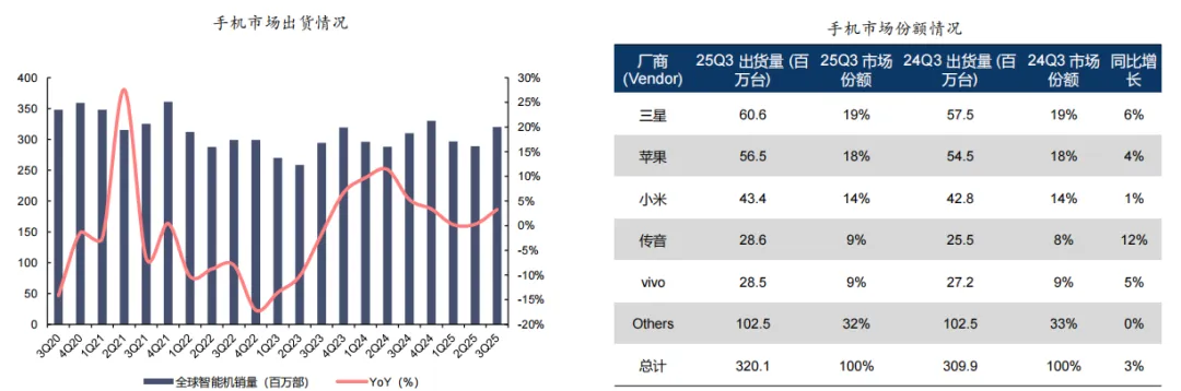 智能手机市场经历了2023年的低迷后,2024年实现了全年的稳步增长,2025年增速虽有所放缓但仍保持正向态势。3Q25出货量3.2亿部,同比增长3%,新兴市场需求相对更优。