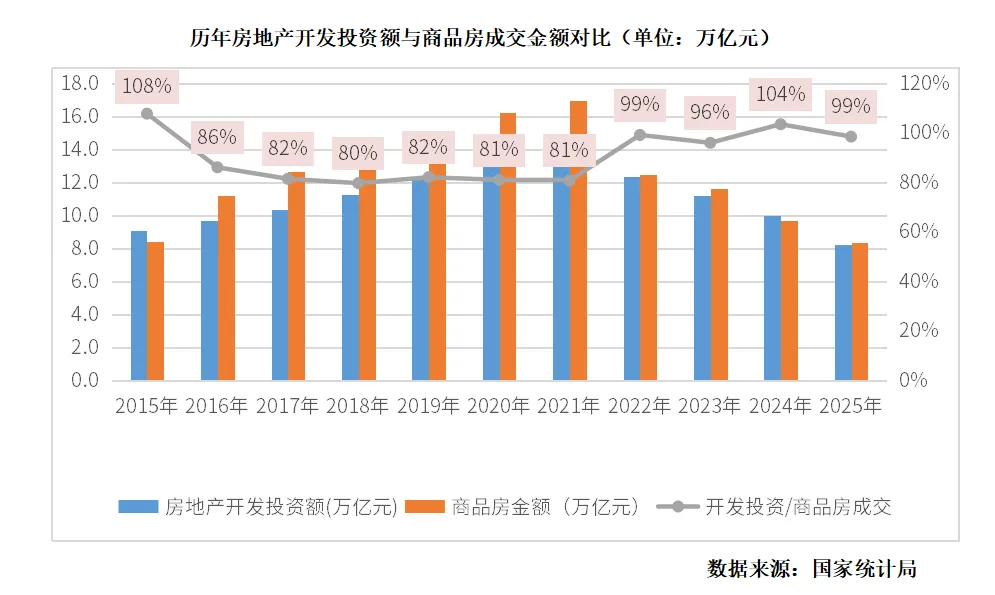 投资与交易规模的适配同样关键,2025年全国房地产开发投资额达8.3万亿元,同比下降17.2%,其占新房成交金额的比重降至98.6%,投资规模再度低于销售规模,标志着行业整体“现金流”再度转正。这一转变是以销定投模式的核心体现,既为项目日常运营、利润释放奠定基础,也印证了投资规模与交易市场的良性适配。