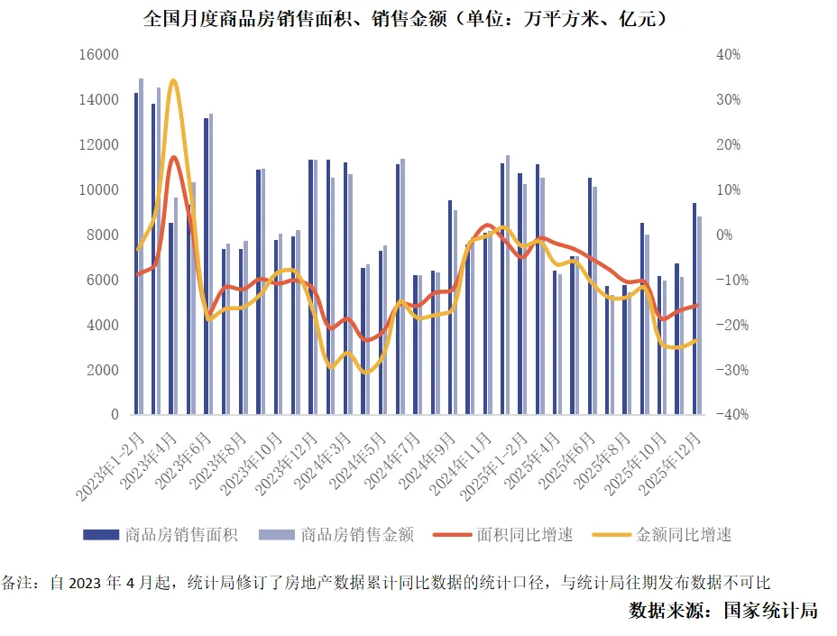 受上年基数大幅上升影响,2025年新建商品房销售面积8.8亿平方米,同比下降8.7%;销售金额8.4万亿元,同比下降12.6%,累计降幅较前11月有所扩大。但单月数据呈现边际改善,12月销售面积降幅较上月收窄1.2个百分点至15.8%,房企到位资金中个人按揭贷款新增1066亿元,环比增加114亿元,市场需求端已出现企稳动能。