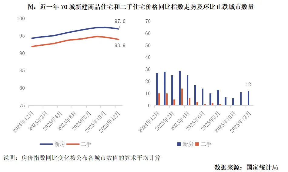 2025年12月,70个大中城市商品住宅销售价格环比总体下降、同比降幅扩大。一手房价同比指数下降3.0%,一线城市同比下降1.7%,二、三线城市分别下降2.5%和3.7%;环比方面,一线城市降幅收窄0.1个百分点,二、三线城市环比下降0.4%。