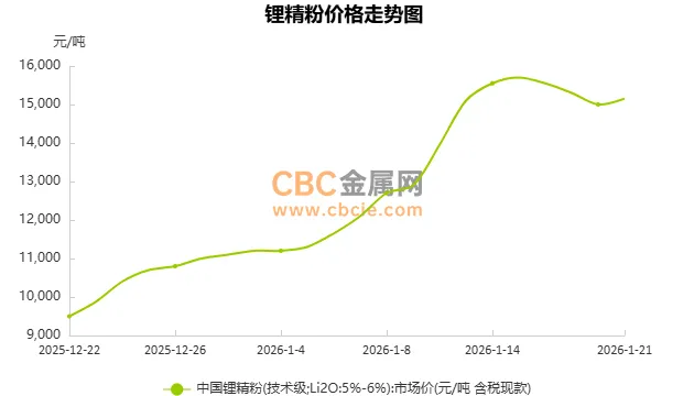 今日中国锂精粉(技术级;Li2O:5~6%)市场含税现款报价上涨,目前在13100~17200元/吨,均价15150元/吨,较昨日上涨150元/吨。