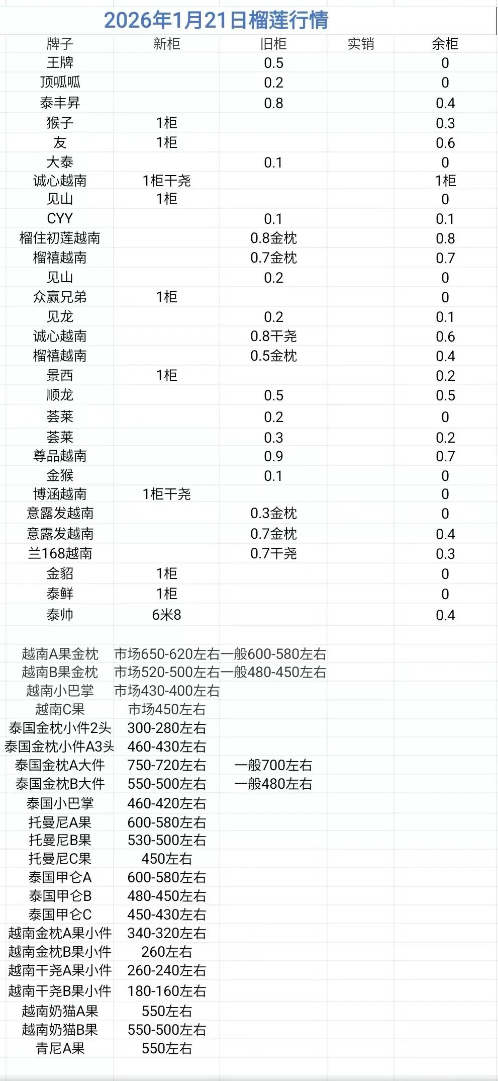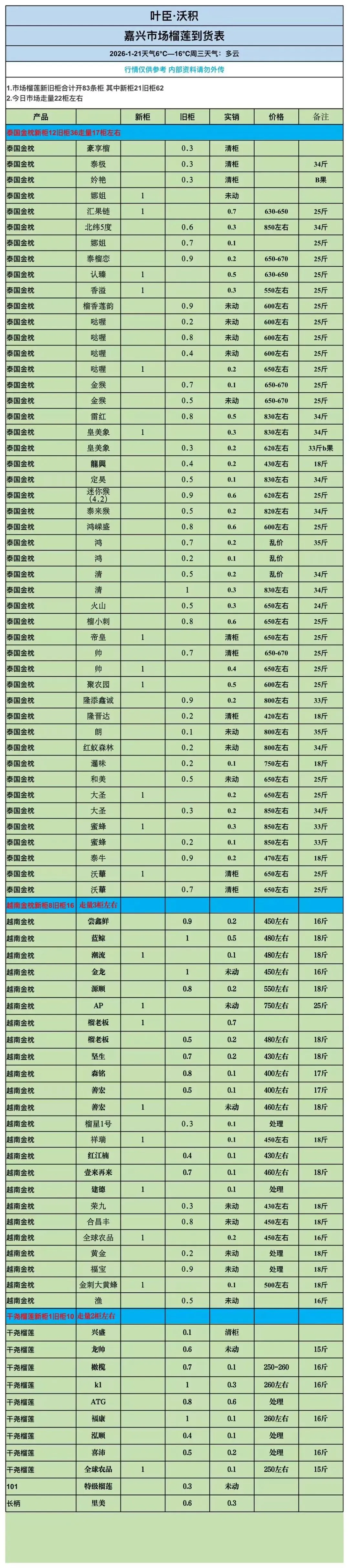 1月21号高碑店、嘉兴、昆明、广州榴莲行情.