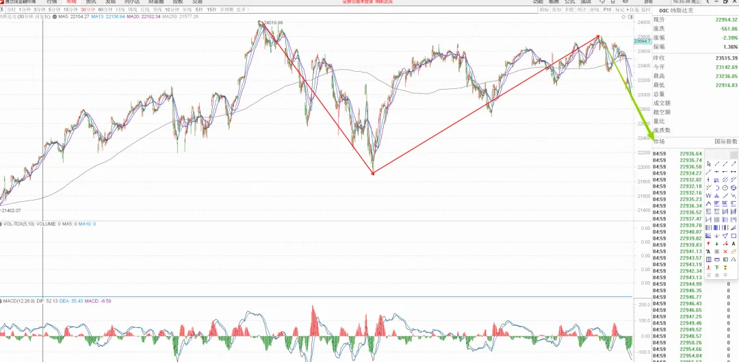 关于纳指,其实反复讲过,前一波30min向下段结束后,右侧的向上段连新高都没给,直接下去了,形势不妙。