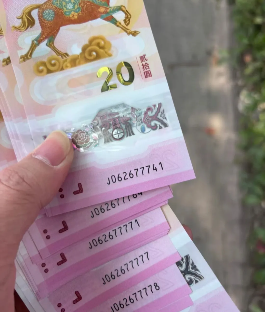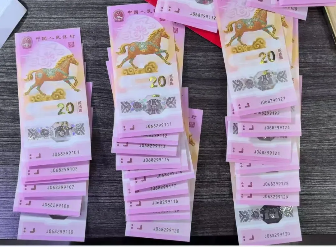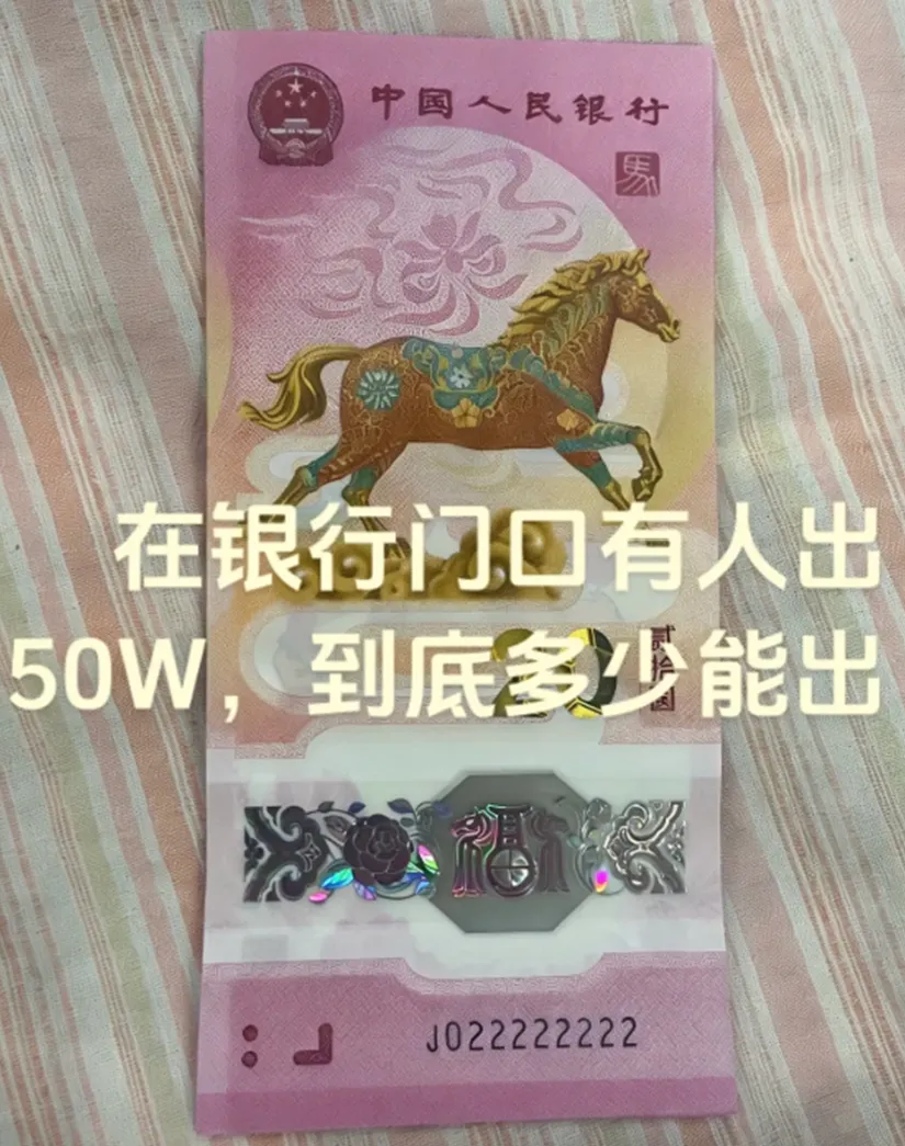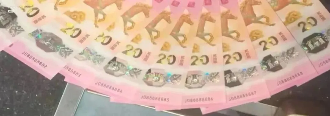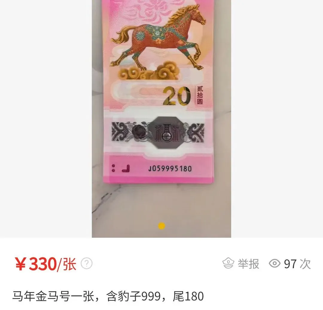 马钞、马币现已进入兑换阶段,时间持续至26号,成功约到的藏友记得抓紧去兑换。没约到的藏友也不用灰心,今年还有一次二次预约机会!还得是马钞、马币,兑换首日各银行网点这大排长龙的火爆场面,完全不是其他币种可以比拟的。比如说通天2“J022222222”,据说银行门口黄牛现场出价50万,但目前还没交易。还有通天6,花落上海普陀区金沙路支行,昨天下午已经兑换到J066666626,今天虽然没啥消息,但按理说应该出来了。更绝的是,超绝大靓号通天8“J088888888”已经在浙江台州三门县被成功兑换出来了。这张通天8马钞,妥妥的又一百万级存在。毕竟,上个月含通天8的一刀蛇钞最终以260万(含佣金299万)拍卖成交,活生生的例子就在眼前。在这种暴富神话色彩加持下,一直以来生肖钞号码玩法十分坚挺,行情十分火爆。在生肖钞号码玩法中,一些经典号码玩法始终深受市场青睐。比如说号码无4、无47、无347等。常见的我都一一整理出来了,不清楚的藏友赶紧瞅瞅~尾同号:号码末尾有多个相同的数字。从最后3个数字相同到最后7个数字相同,分别叫:豹子号/狮子号/老虎号/大象号/恐龙号。尾号相同的数字越多,价格越高。而上文提到的通天号,是最顶的存在,末尾8个数字均相同。倒置号、圆圆号:倒置号只由“0、1、6、8、9”五位数字组成,圆圆号是倒置号的升级版,只由“0、6、8、9”组成,没有数字“1”。金马号、金马王:号码无2347的纪念钞,也是倒置号01689任意组合+5。金马王则是号码无12347的统称,也是圆圆号0689任意组合+5。这两天不少藏友都跑来问我,自己的号码价值多少。为此我特地整理了一份详细的价格表,包括各种常见号码,大伙可添加微信客服获取~没约到的藏友也不用灰心,接下来还有二次预约机会!按惯例大概在4月份左右,大伙记得加我微信好友,公告出来后立马告诉大家~没约到或者舍不得拆的藏友,我替大伙拍了一波高清图片和视频,快来一饱眼福吧~从实物来看,马钞、马币的实物相当不错。特别是马币,活灵活现的非常漂亮~将马币倾斜角度,可以看到“10”和“RMB”隐形图文,还有微缩文字以及防伪点阵。动感全息效果和透明视窗,一如既往的出色。最惊艳的是面额“20”的光彩光变效果,贼好看!