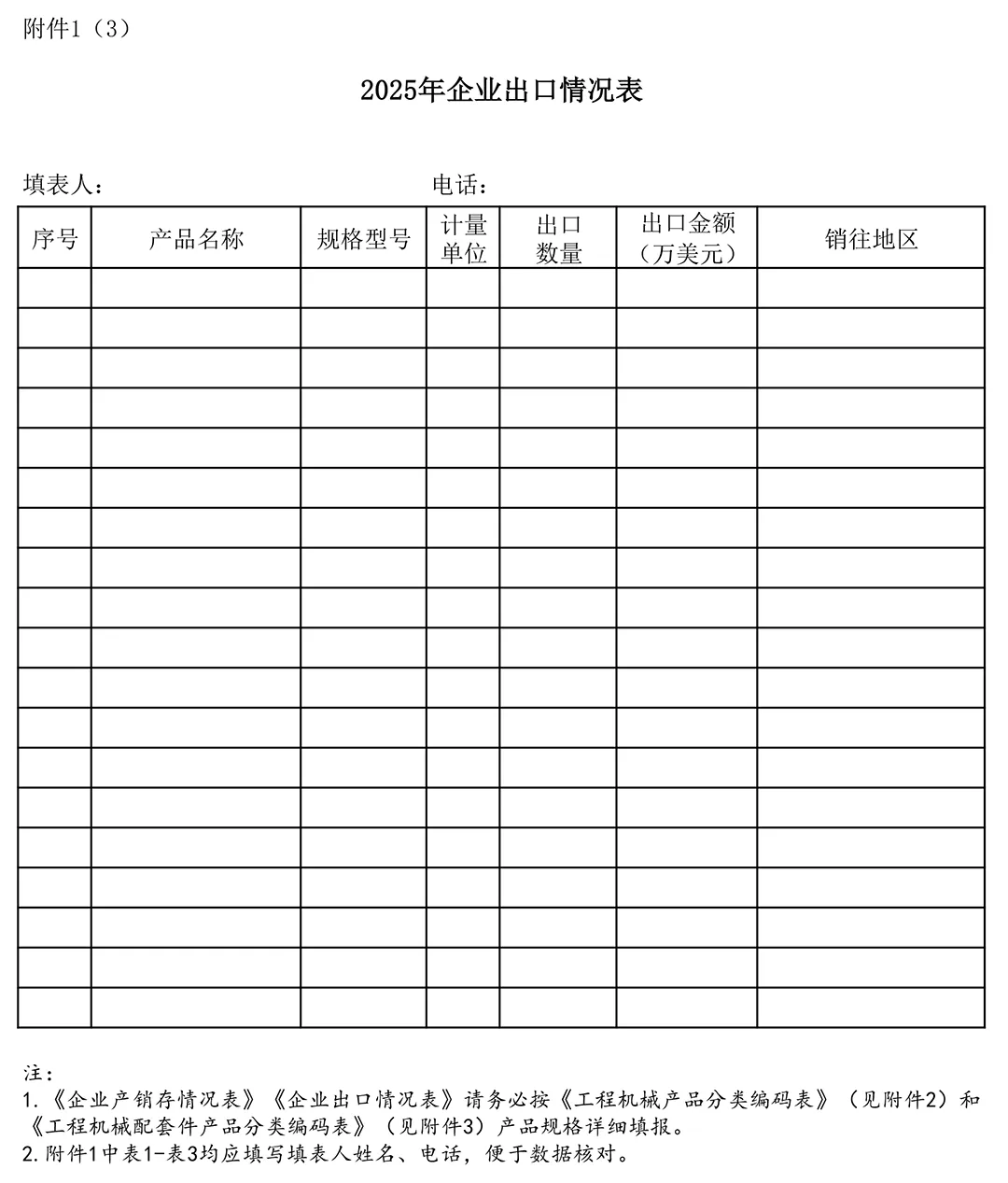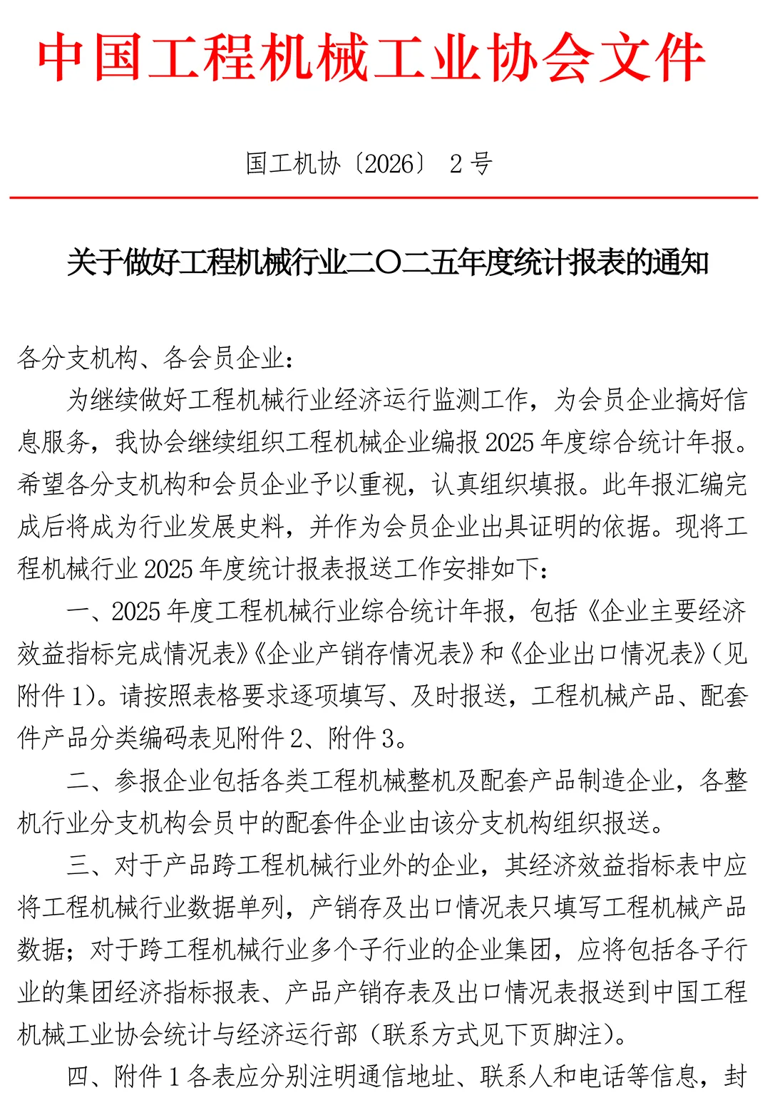 一、2025年度工程机械行业综合统计年报,包括《企业主要经济效益指标完成情况表》《企业产销存情况表》和《企业出口情况表》(见附件1)。请按照表格要求逐项填写、及时报送,工程机械产品、配套件产品分类编码表见附件2、附件3。