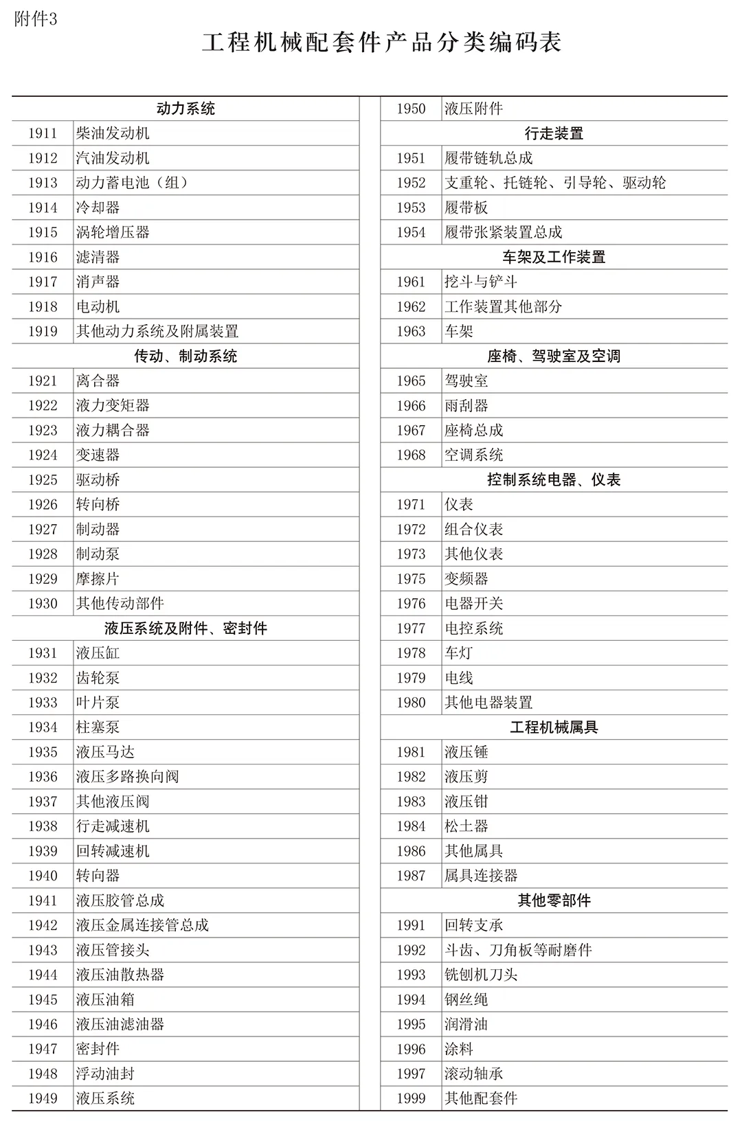 3. 工程机械配套件产品分类编码表