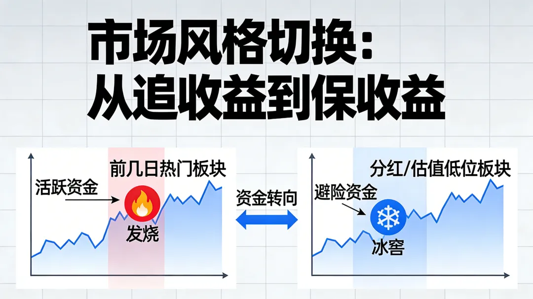 今天的盘面,看完真的让人有点苦笑。你能明显感觉到:活跃资金的求生欲,前几天还发烧的板块,转眼进了冰窖,有分红的、有估值的、相对低位的方向,被迫承接避险资金,这说明什么?说明市场从“追收益”,开始转向“保收益”了。