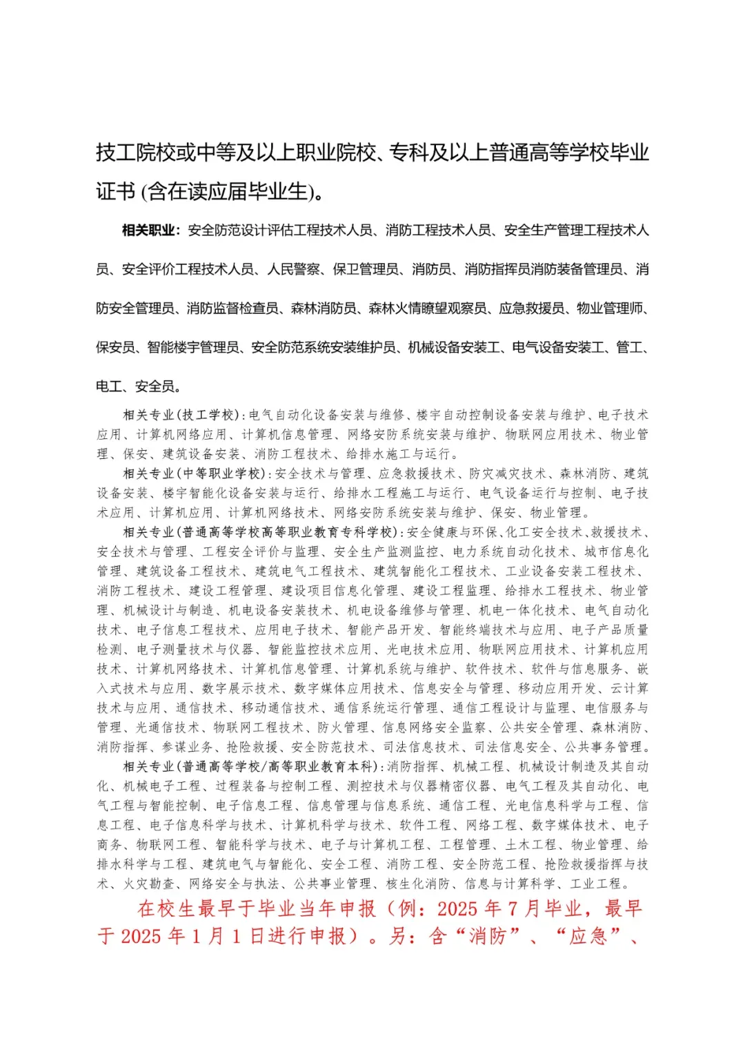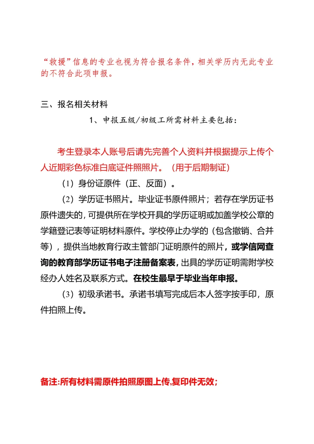 注:符合相关专业毕业生条件的无需填写承诺书内工作证明经历,学历栏需提供学信网查询的教育部学历证书电子注册备案表(有效期内且带清晰二维码),中等职业学校及技工院校符合相关专业条件的同样需提供中等职业教育学历认证报告(https://xlrz.vae.ha.cn/00/1000.htm)或全国技工院校毕业证书信息查询系统查询的学籍信息(http://rsrc.mohrss.gov.cn/jxxxcx/Omp.do?method=fwdPageJgyxCertInfoEntry);户口本上显示学历无效。函授中专仅可作为学历使用不可作为相关专业进行申报,另:含“消防”、“应急”、“救援”信息的专业也视为符合相关专业报名条件,其他与标准内相关专业不一致的考生不可按相关专业条件申报。