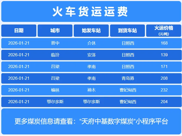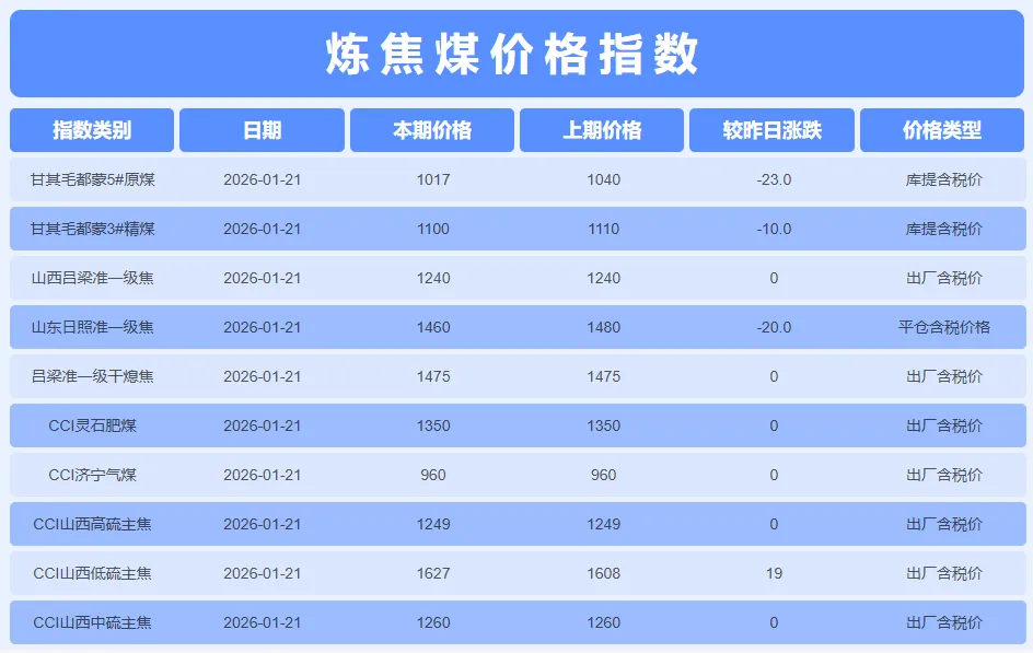 2026年1月21日,炼焦煤市场呈现显著的结构性分化格局,价格走势出现明显背离。CCI山西低硫主焦煤价格强势上行,出厂含税价达1627元/吨,单日上涨19元/吨,创下近期新高,反映出在钢铁企业高炉炼铁对优质炼焦煤刚性需求支撑下,低硫主焦煤因具备优异结焦性能,市场交投活跃,供给端挺价意愿强烈。而山西高硫、中硫主焦煤、灵石肥煤及济宁气煤等品种价格则全面持稳,反映出中高硫及配焦煤种需求疲软,市场成交清淡,缺乏上涨动能,上下游博弈中买方占据主导地位。