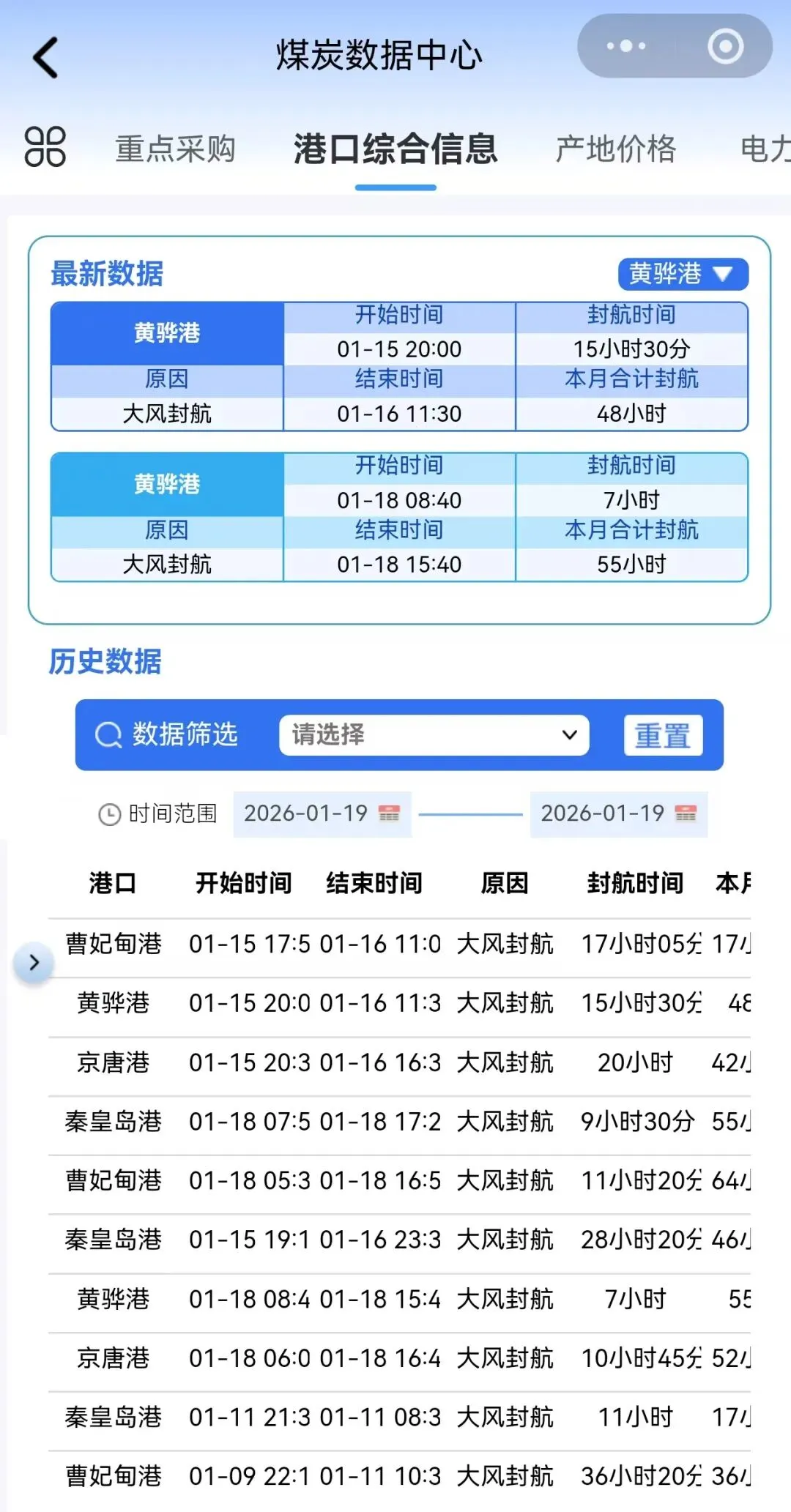 2026年1月18日秦皇岛港因大风封航,本次封航时间为9小时30分,本月累计封航时间为55小时35分;曹妃甸港因大风封航,本次封航时间为11小时20分钟,本月累计封航时间为64小时45分钟;黄骅港因大风封航,本次封航时间为7小时,本月累计封航时间为55小时;京唐港因大风封航,本次封航时间为10小时45分,本月累计封航时间为52小时55分。