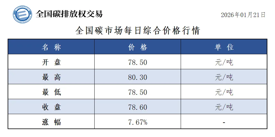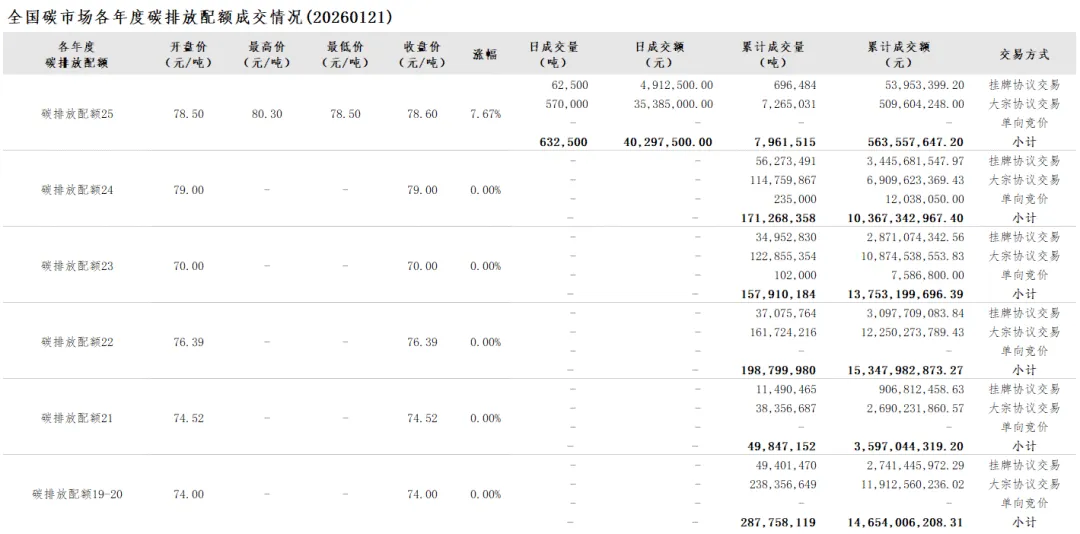 2026年1月1日至1月21日,全国碳市场碳排放配额成交量8,678,788吨,成交额620,515,480.20元。