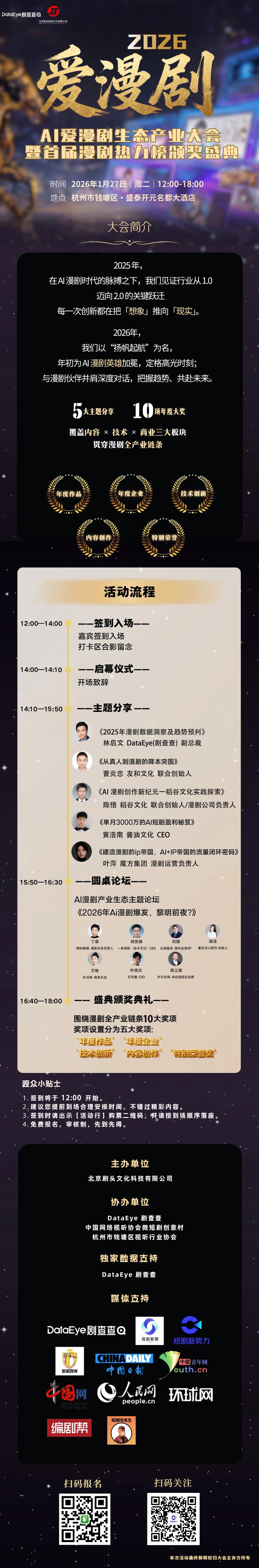 2026年1月27日,杭州见!这不是一场普通的会议,而是AI漫剧产业的“成人礼”——我们见证过1.0时代的野蛮生长,更期待与你共同定义2.0时代的黄金规则。