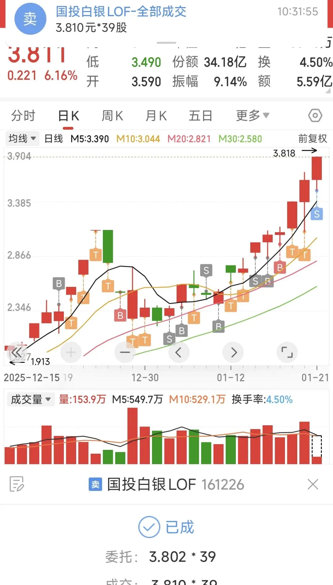 撸毛套利 161226白银LOF,居然停牌了,哈哈第一次遇见。1月21日晚间,国投白银LOF基金(以下简称“本基金”)发布公告称,为保护投资者利益,本基金将于1月22日开市起停牌至收市。若本基金1月23日二级市场交易价格溢价幅度未有效回落,本基金有权通过向深交所申请盘中临时停牌、延长停牌时间等措施,向市场警示风险。
