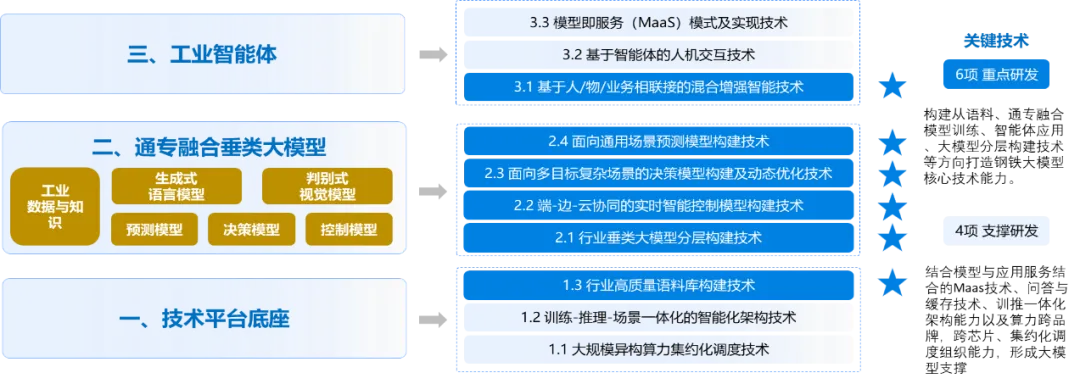 因此,亟需建设面向钢铁制造的“通专融合”垂类大模型,系统统筹数据、算力、模型与场景,打通“能力构建—业务闭环—价值度量”,形成可落地、可运营、可规模化推广的“AI+”解决方案体系,为行业智能化升级提供持续动能。