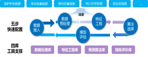 (3)面向通用场景的预测模型构建技术:针对钢铁生产中普遍存在的工艺参数预测、质量趋势预测与设备状态预测等需求,从“个性化开发成本高、周期长、复用难”的痛点出发,研究了预测模型标准化开发与平台化部署的新模式。通过突破建模工具组件的柔性解耦与组装、多算法集成算子库、算法自动调优以及训推协同的云边构建等关键技术,形成以“五步四库”为核心的工程化方法,将定制化配置与标准化流程结合,实现预测模型开发—训练—评估—部署—迭代的全流程自动化,显著降低开发门槛并缩短交付周期。提供全面、科学的算法调优工具,提升模型预测精度;支持使用云上算力训练、边端部署下发的平台化开发能力,具备模型自学习、自更新的能力。