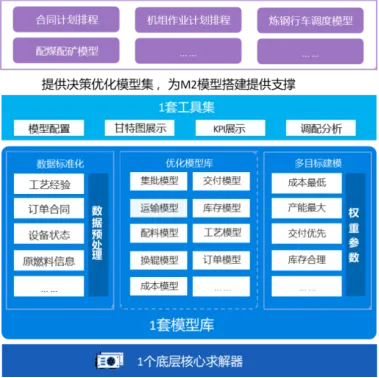 (4)面向多目标复杂场景的决策模型构建及动态优化技术:随着单机组决策模型应用的初步成熟,技术迭代正聚焦于多工序、多路径交织的多目标复杂场景,旨在实现成本、效率、质量等多维目标的动态平衡与全局优化。面向这类场景的决策模型构建及动态优化技术,通过构建覆盖全流程的智能决策体系,形成1个底层通用求解器、1套模型库和1套工具集,为供应链管理、生产排程、调度优化等各类决策场景应用提供支撑,破解传统静态决策模式在实时性、协同性和多目标权衡上的瓶颈,显著提升了决策的时效性与准确性。