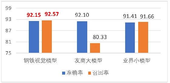 (1)安防管控:钢铁生产现场环境复杂,安全管控压力巨大,安防工作成为保障企业平稳运营的核心环节。结合业界先进深度学习算法和现场图片素材,研发安防视觉监控模型替代传统安全员人眼监测的方式,其中安全穿戴类模型识别准确率已达98%左右、安全作业禁区闯入类模型识别准确率也达到95%。