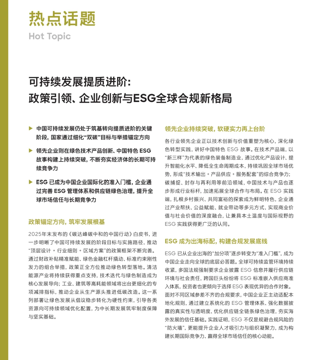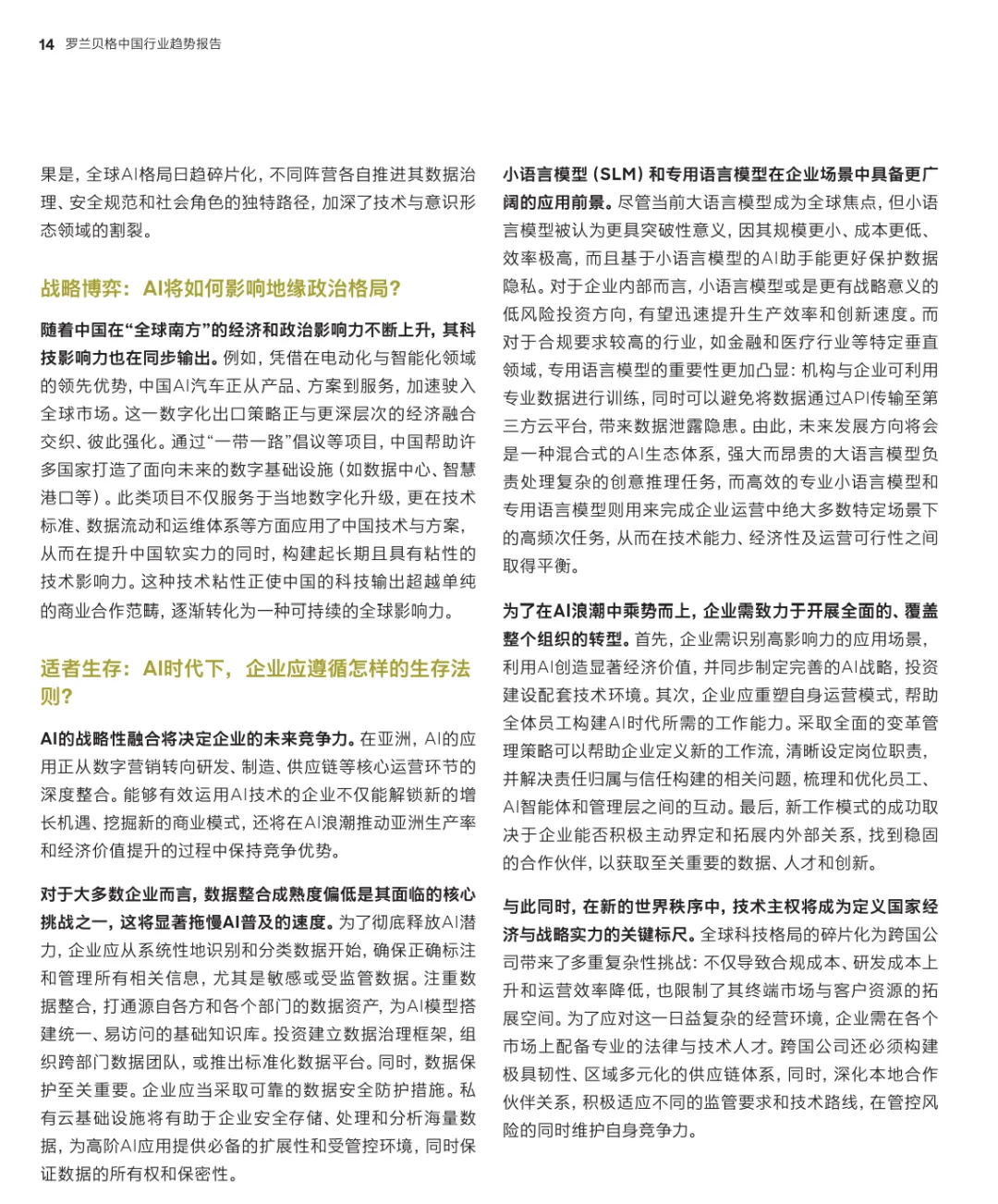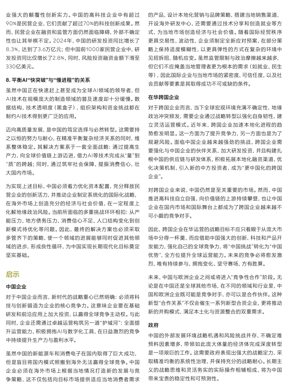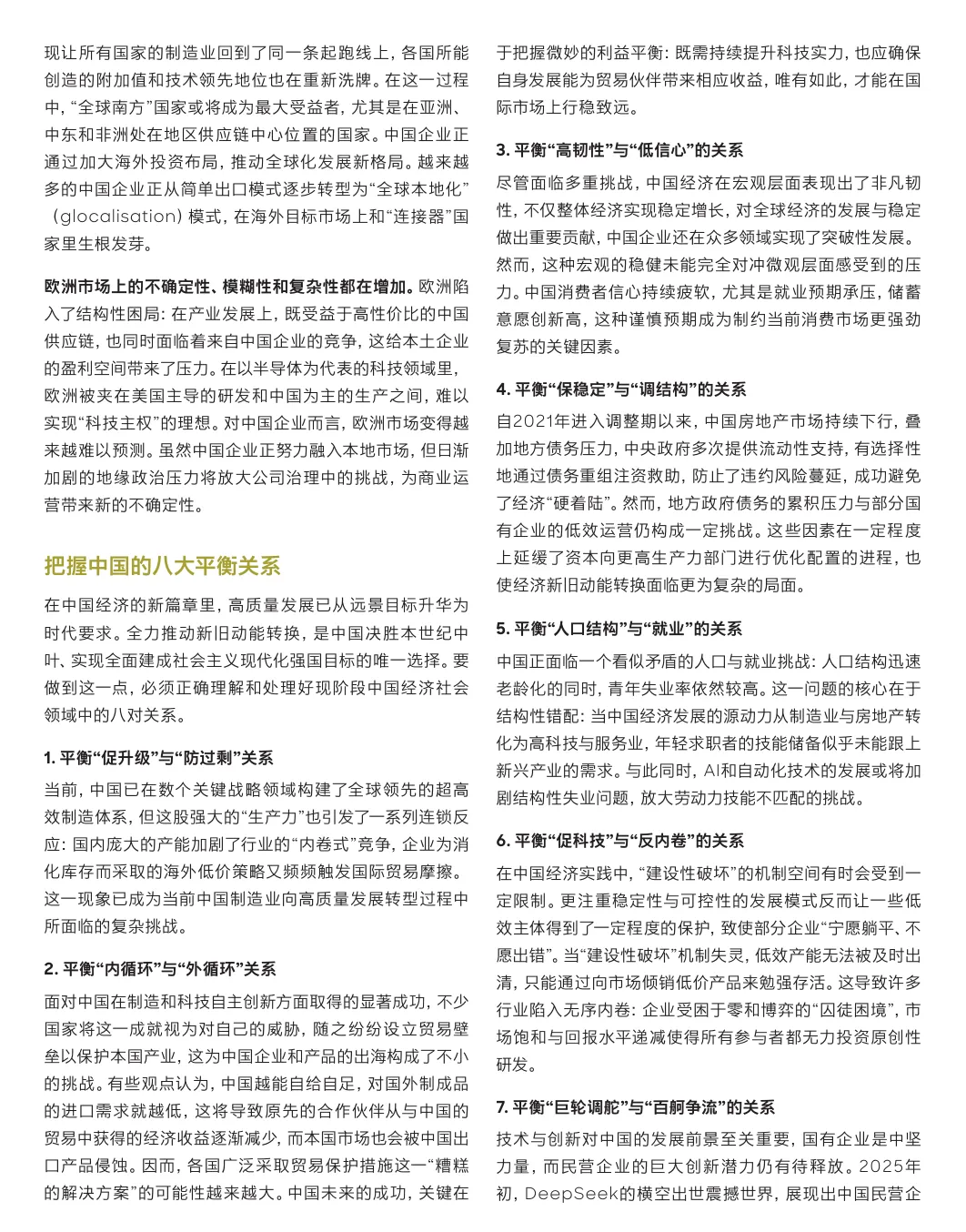 中国在“十五五”规划开局之年,正处于迈向高质量发展和可持续现代化的关键转型期。报告核心视角是“平衡的艺术”,强调需辩证处理促升级与防过剩、内循环与外循环、高韧性与低信心等八大关系,以在全球新秩序中释放发展潜力。科技创新成为核心引擎,人工智能正从模型竞赛转向与研发、制造等核心运营环节的深度融合与价值创造。企业国际化征程亦从“规模化出海”步入“高质量全球化”新阶段,对深度运营与体系化能力提出更高要求。各主要行业,如汽车(淘汰赛深化与AI决战)、消费品(需求分层与DTC生态)、能源(以消纳为王的新挑战)及高科技等行业,均围绕技术突破、效率提升与可持续性展开深刻的结构性变革与价值重构。【引用说明】:本文源自网络,版权归原作者所有,助力大家开展相关研究需要。