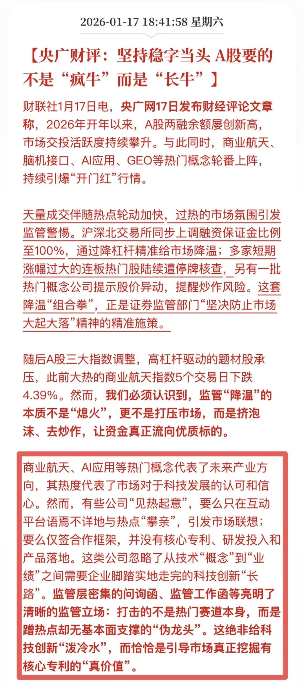 这,让不少朋友产生一种想法:AI应用会不会接棒前两年的AI硬件,成为下一个市场主线?但行情从来不会一路高歌,就在市场情绪高涨之际,监管出手了。某官媒甚至还特意点名了商业航天和AI应用板块,直接明示希望给这波炒作降降温: