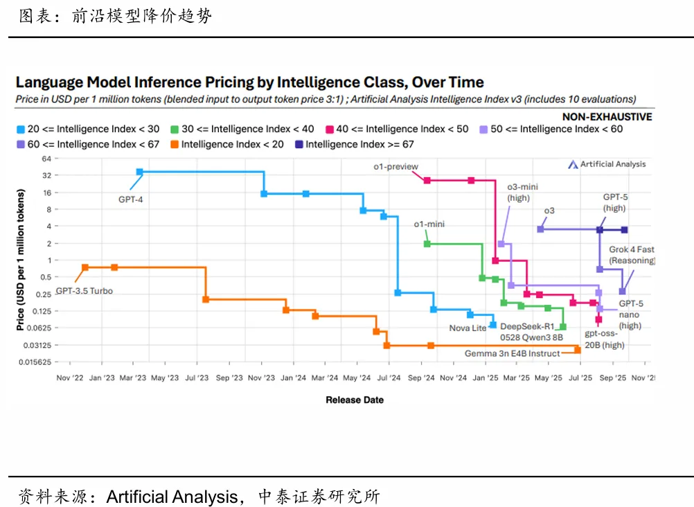 以达到GPT3.5水平的模型为例,其推理成本从22年11月的20美元/每百万词元降至24年10月的0.07美元/每百万词元,约1.5 年内下降超280倍。