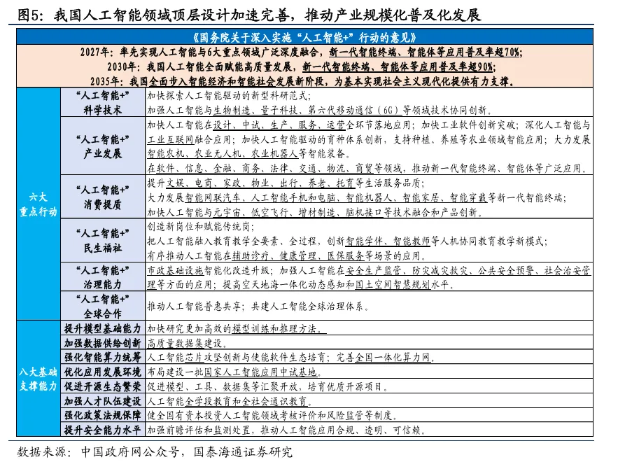 25年8月26日,国务院发布《关于深入实施“人工智能+”行动的意见》中,明确了新一代智能终端、智能体等应用的普及率目标,为我国AI产业大规模应用指明了路线图。