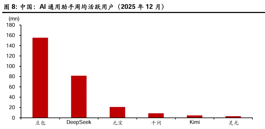 目前头部厂商字节豆包/DeepSeek/腾讯元宝,25年12月周均活跃用户分别为1.55/0.82/0.21亿。