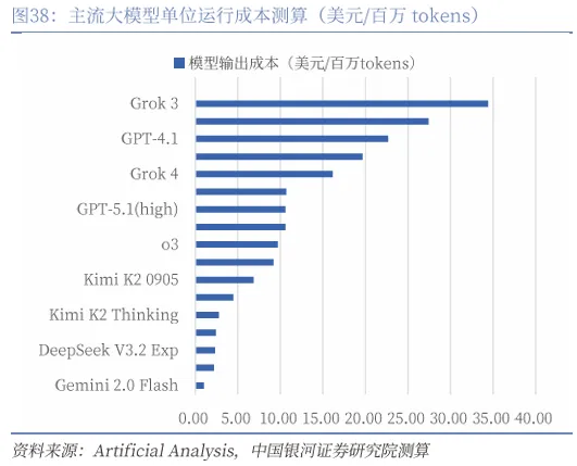 因为国产大模型有明显的成本优势。目前主流大模型的输出成本大部分集中在2美元/百万词元—25美元/百万词元,我们的大模型是多少呢?GPT-5.1,约为10.62美元/百万词元;而我们的KimiK2Thinking大模型更低,只要2.76美元/百万词元。