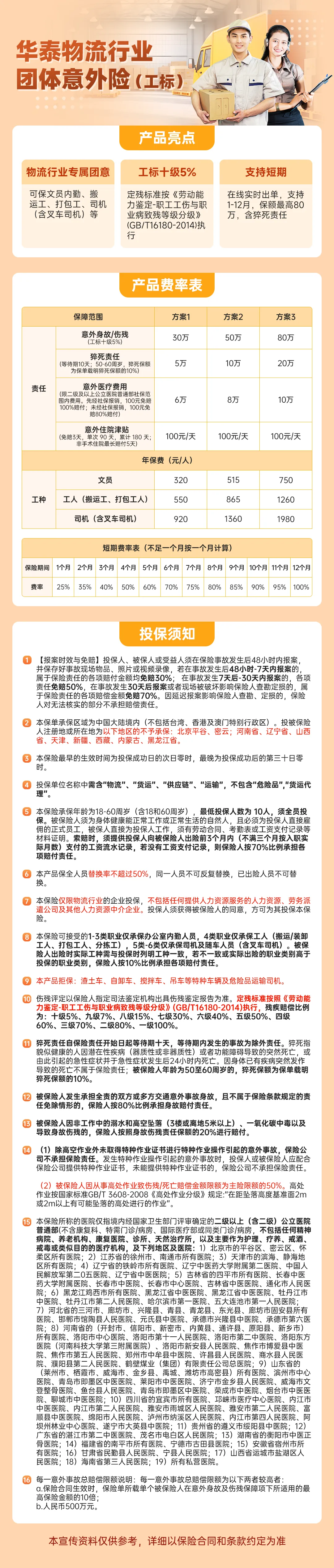 ①工标5%起;最高80万保额;1~12个月保期可选②物流行业专属工标团意:可保办公室内勤人员、工人(搬运/装卸工人、打包工人、分拣工)、司机及随车人员(含叉车司机)③保高空作业,不强制要求高空作业证;保猝死,最高20万保额;