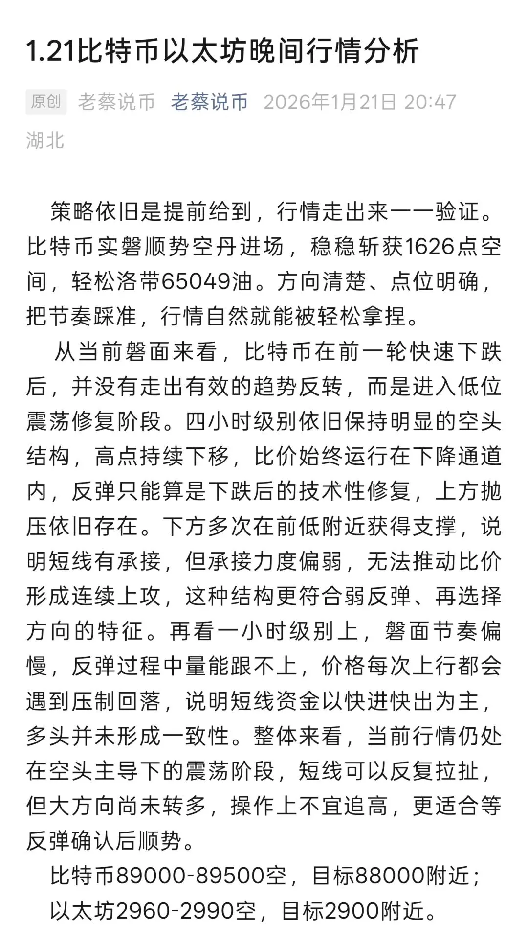比特币89500-90000空,目标98600附近;