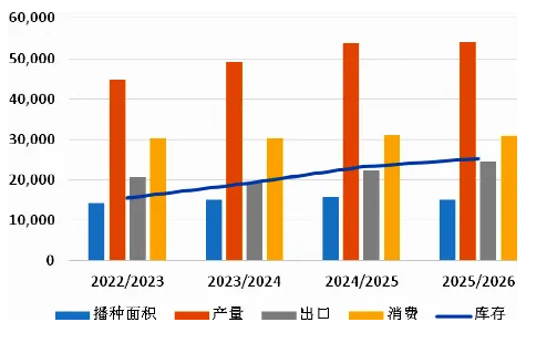 尽管美小麦种植面积处于低位,但是结转库存接近10亿蒲式耳,只有库存被消化掉,美麦价格才能摆脱弱势。中长期而言,导致美麦减产的拉尼娜不太可能发生,如果2026/2027年度种植面积和单产维持不变,那么,美麦结转库存可能超过10亿蒲式耳,并维持当前价格区间。