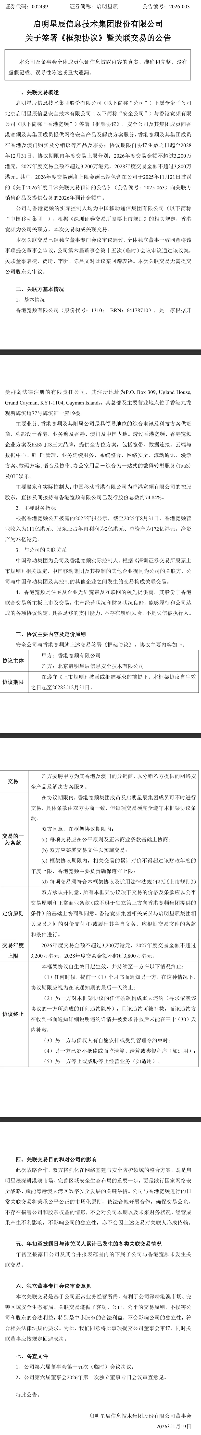 启明星辰集团1月19日发布《关于签署《框架协议》暨关联交易的公告》,