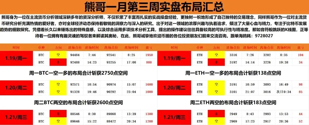 数字跃动间,机遇似闪电划破长空,财富浪潮汹涌翻卷。在这里,每一秒都是惊心动魄的冒险,每一笔交易皆藏着逆袭乾坤之可能!周三日内白盘呈现出先扬后抑的走法,比特币价格先是由早间时分87787低点一线反弹收复至午间时分的90088高点一线后止步承压,随即逐步回落至晚间时分的88109低点一线,以太坊日内白盘同样是跟随比特币的走法,价格从早间时分的2910低点一线上扬至午间时分的3001高点一线后止步,随即承压下行,直至晚间时分行情最低回落至2900低点一线。熊哥日内白盘也是进行比特币及以太坊一多一空的布局,并完成多空双斩,早间同时布局的比特币及以太坊多单,分别在88546附近和2949附近进场,在89868附近和2993附近离场,比特币多单斩获1300点空间,以太坊多单斩获44点空间,午后再次同时布局比特币及以太坊空单,分别在89646附近和2969附近进场,在88472附近2917附近离场,比特币空单再次收下1200点空间,以太坊空单再次收下52点空间。
