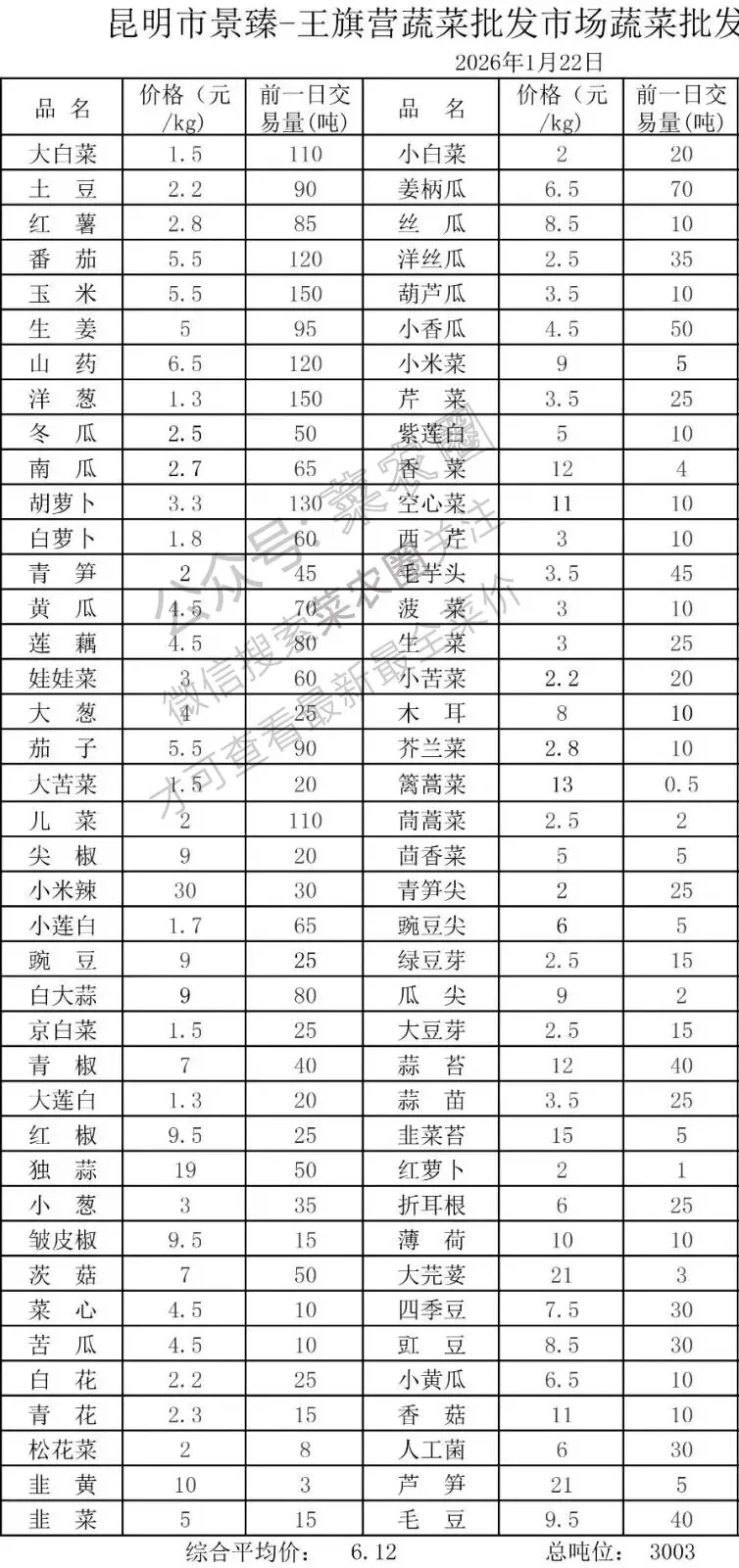 云南蔬菜每日价格行情 2026年1月22日云南综合菜价查询