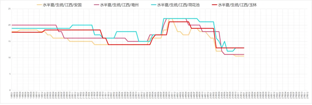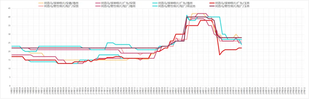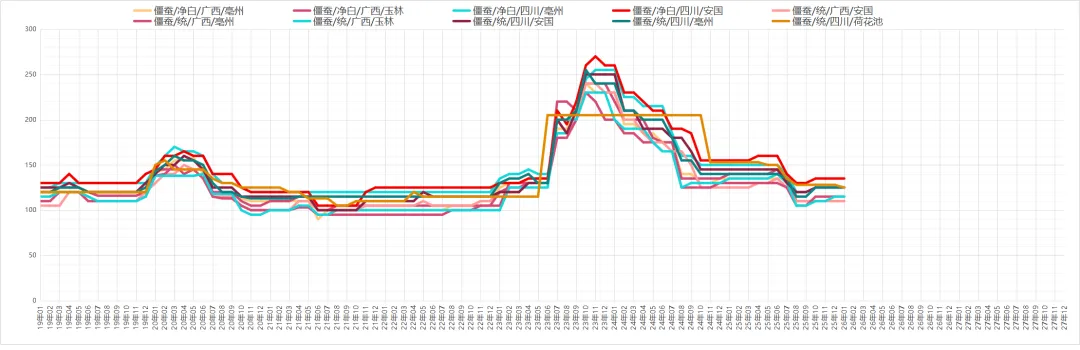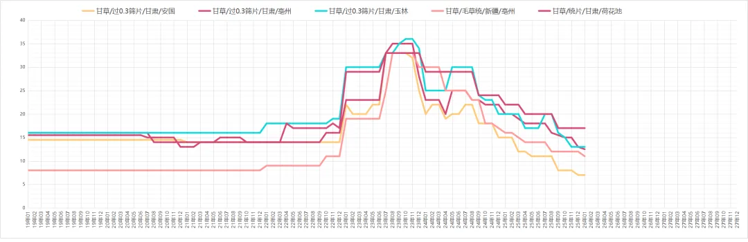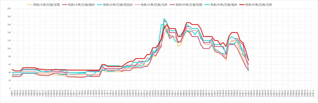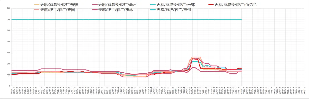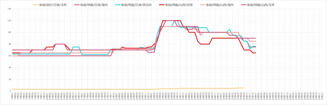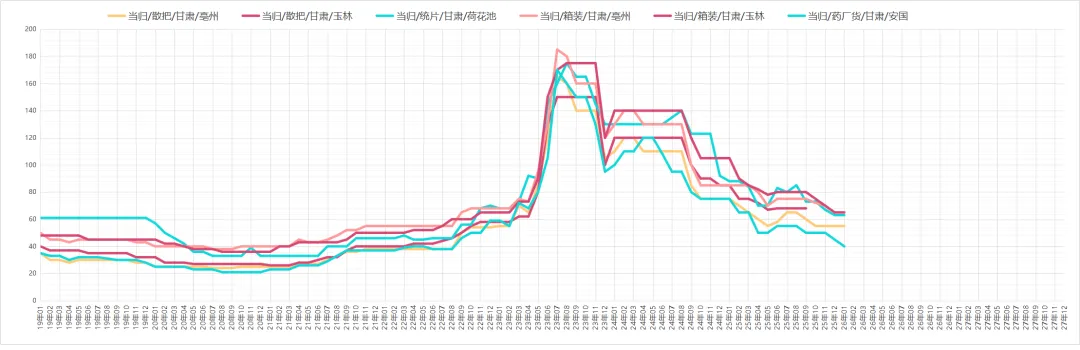 因现价偏低吸引商家关注介入,货源走销顺畅。价格:够含量35丁6元,58丁12-14元,8-12片约25元。商家多以询价为主,实际采购意愿一般,货源小批量走销。价格:统货30-32元,包检净货约34元。本地尚有货源待售,临近春节寻货商家减少,货源走销不及前期。价格:全检合格中统货110-113元,大统货量少,价格120-125元。货源持续外走导致产地库存不丰,但近期寻货商家不多、走货偏慢。价格:药厂投料货约40元,统货40-41元,饮片货55-58元。采挖进入中期,新货干品陆续上市,商家及厂家关注跟进,货源正常走销。价格:家种货20元,野生货21-22元。产地货源充裕,市场关注度提升,走货加快且持货商惜售心理增强。价格:家种光苍术辽宁货23-24元,内蒙货28-30元。仍有商家寻货,产地库存充足,持货商售货积极。价格:药厂货约62元,软切货75元,硬切货90元上下。产地库存偏薄,多商家寻货,货源走销顺畅。价格:广西货100-105元;云南货中条120元、中大条125元、大条130元。现价偏低吸引商家趁低价购货,产地库存充足,商家售货积极,统装货交易价约6.2元。产新基本结束,新货大量上市,因前期地块死苗,预计产量不及去年,商家陆续寻货,货源走销畅快。价格:一般统货9-9.5元,好统货9.5-10元,饮片货12元,0.8以上选货13.5-14元。产地货源充足,近期关注商家较少。价格:统货约6.5元。鲜货收购价约7元,近期寻货商家少,货源以小批量交易为主,统货售价23-24元。今年整体产量不大,近期商家陆续寻货,货源按需走销,去皮斜片售价约28元。产地货源充足,临近年关寻货商家少,货源走销不畅。价格:大片约150元,小片125元信息来自中药材天地网、药通网等,药势综合整理侵权请及时联系删除