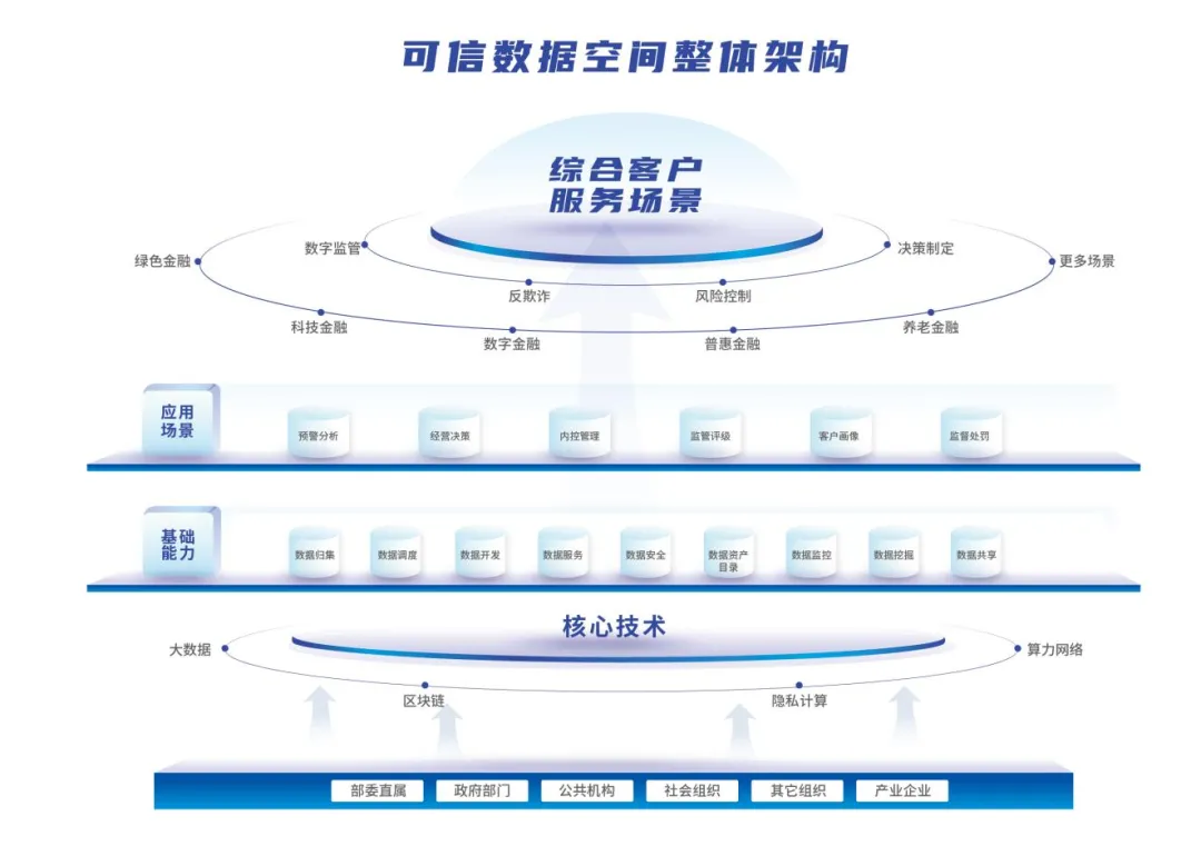 鉴于数据涉及客户隐私与金融安全,数据空间从技术防护和合规体系两方面构建安全保障体系。在合规层面,一是对数据空间内所有数据资源进行敏感性标识与管理;二是对所有数据访问和计算请求进行严格审核,确保其限于特定场景且为最小化必需。在技术层面,打造“分层加密+分布式存证+动态管控”技术防护架构,采用隐私计算及区块链技术,实现数据“可用不可见”,形成不可篡改的存证链条,确保“授权-使用-清算”一致。
