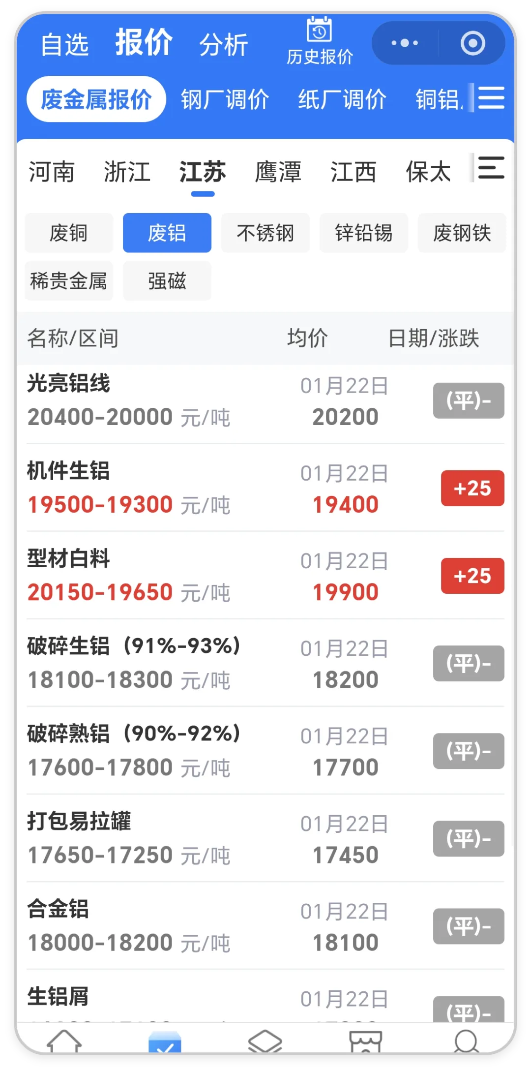 废铝变化不大!全国废铝最新价格行情(1月22日)
