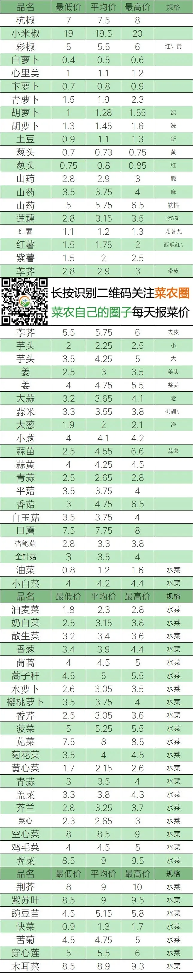 | 品名 | 最低价 | 平均价 | 最高价 | 规格 |