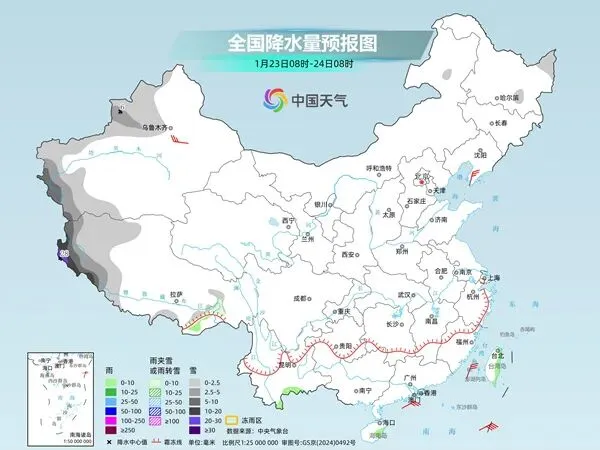 明天,新疆西部、西藏西部等地部分地区有小到中雪或雨夹雪,其中,新疆南疆西部山区、西藏西部等地部分地区有大到暴雪,局地大暴雪。云南南部、海南岛东部、台湾岛东部等地部分地区有小雨。