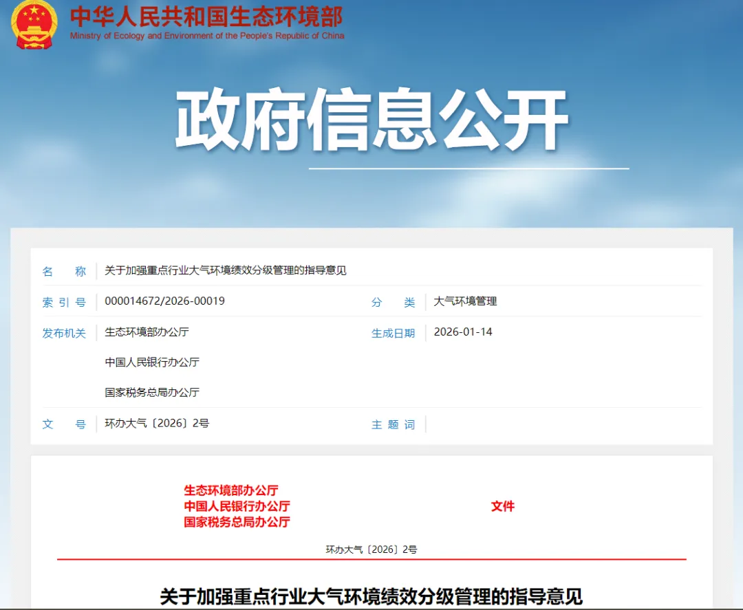 1月14日,生态环境部等发布《关于加强重点行业大气环境绩效分级管理的指导意见》(环办大气〔2026〕2号),全文如下: