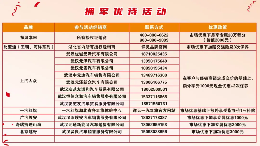 湖北省汽车流通协会携手东风旗下风神、纳米、奕派、本田,以及比亚迪王朝系列、比亚迪海洋系列、广汽埃安、一汽红旗、捷途、上汽大众、北京越野等品牌,与湖北省退役军人事务厅签署协议,承诺为军人军属、部队文职人员、退役军人及其他优抚对象提供专属购车优惠。军人军属、部队文职人员、退役军人和其他优抚对象持相关证件,可在湖北省汽车流通协会所属相关会员企业,享受12个特定品牌,82款车型的军人专享优惠。即在客户与经销商谈定成交价的基础上,根据品牌和车型额外专享1000元、2000元、3000元现金优惠,以及送积分、保养、交强险等优待活动。
