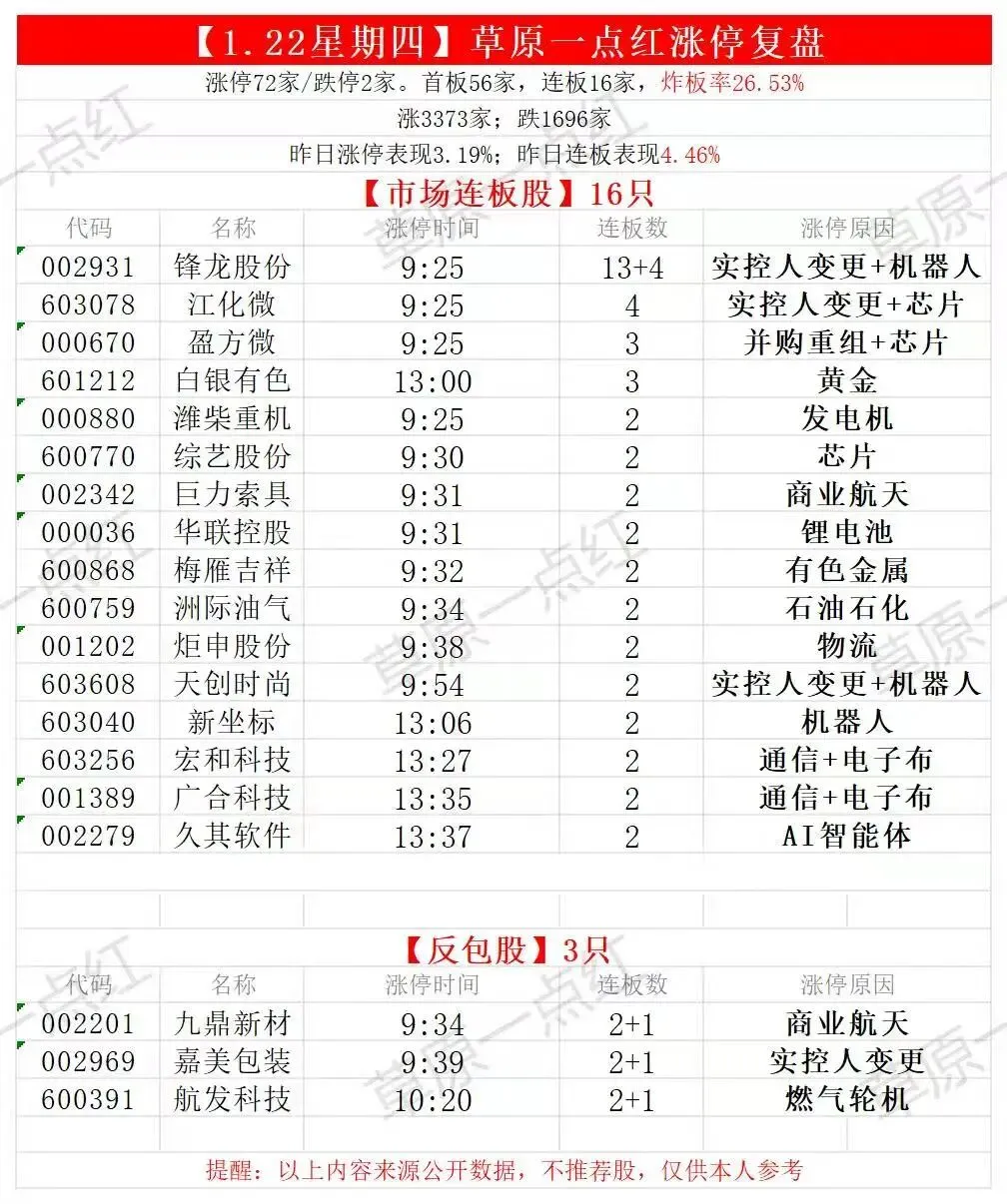 >【1.22星期四复盘】行业航天终于反弹了,少爷概念锋龙股份继续新高,明天估计要开板了