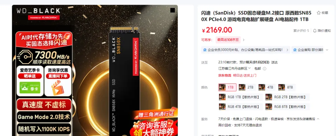 2023年1TB PCIe 4.0 SSD 299元的地板价已成历史,2026年初旗舰款普遍破千,闪迪SN850X 1TB官方价达2169元,三星990Pro 1TB涨至1399元。