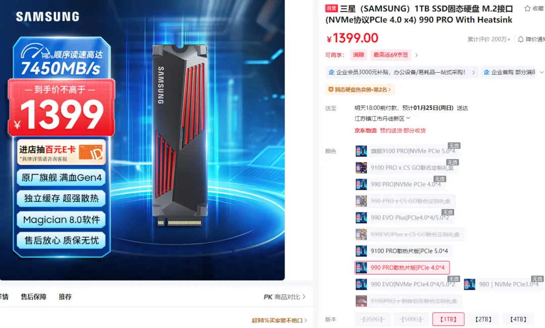 1. 三星990 Pro 1TB(PCIe4.0旗舰)