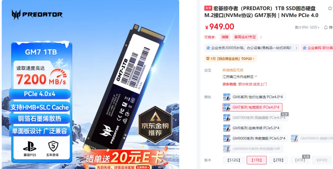 2. 宏碁GM7 1TB(PCIe4.0性价比款)