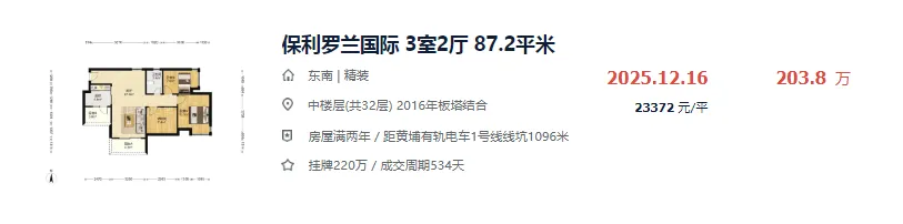 保利罗兰87㎡三房,11月低层成交价175万,单价仅1.99万/㎡,12月中层成交价203万,单价2.3万/㎡,回到2字头,且高了近4000/㎡;90㎡三房,11月北向中层185万,12月北向低层183万,低层总价仅比高层低2万。