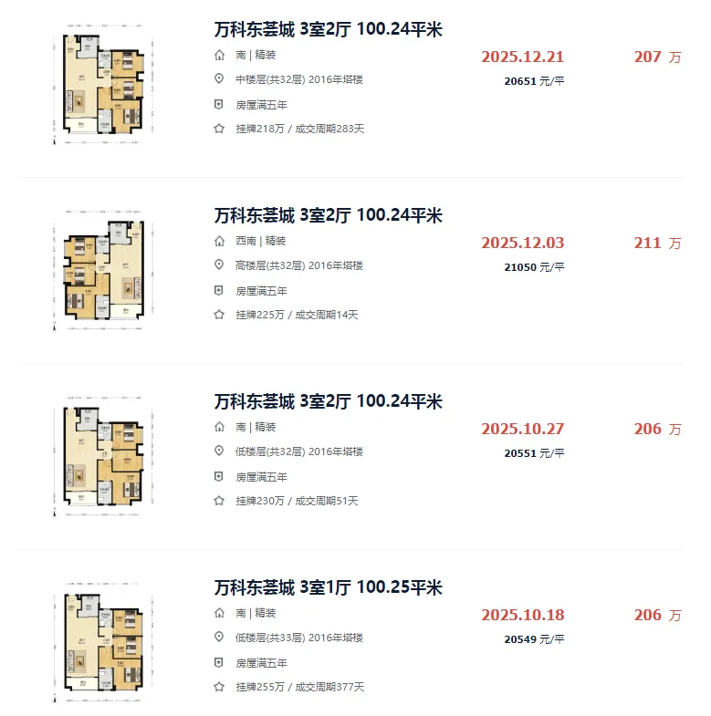 万科东荟城,稳定在1.9万均价,100㎡南向三房,总价基本锁定在 200 万左右,单价 2 万 /㎡,而且这个价格已经扛了半年。