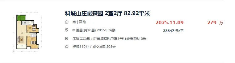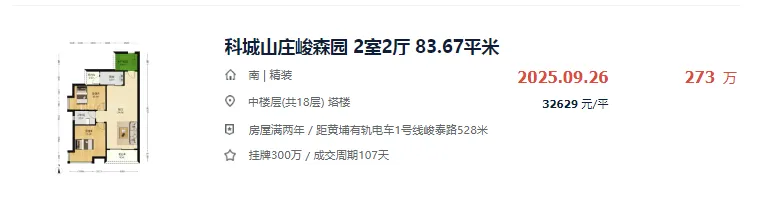 科城山庄,83㎡南向中层两房,9 月成交 273 万,11 月成交价279 万,价格同样稳定。