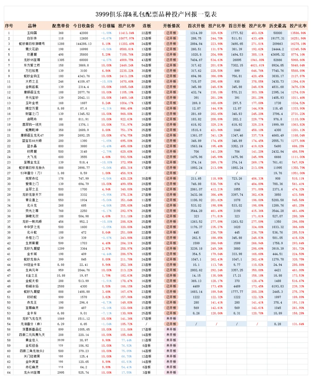 1.22日收盘价已更新。《3999俱乐部&礼包配票品种投产回报一览表》大家可以自行查看。