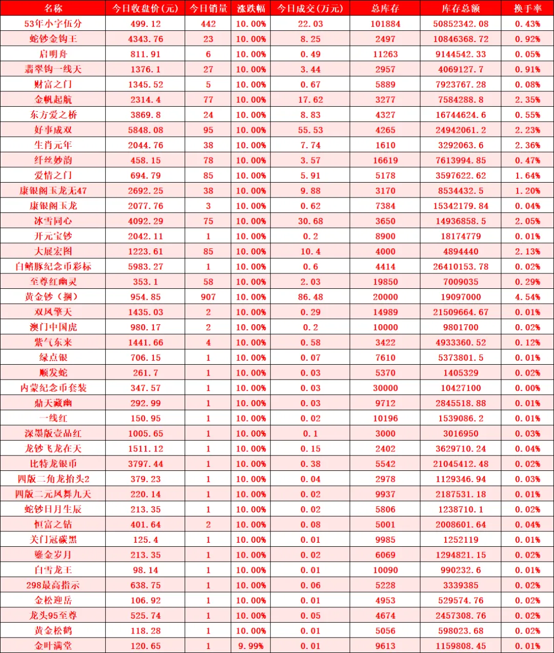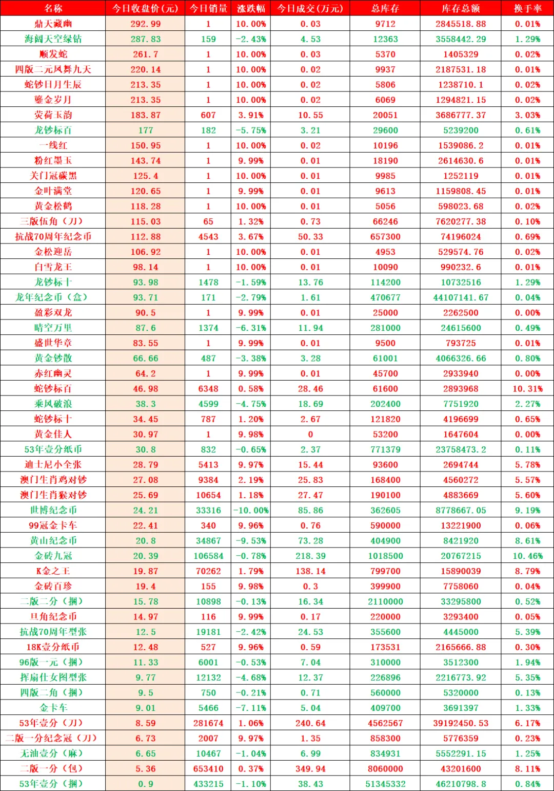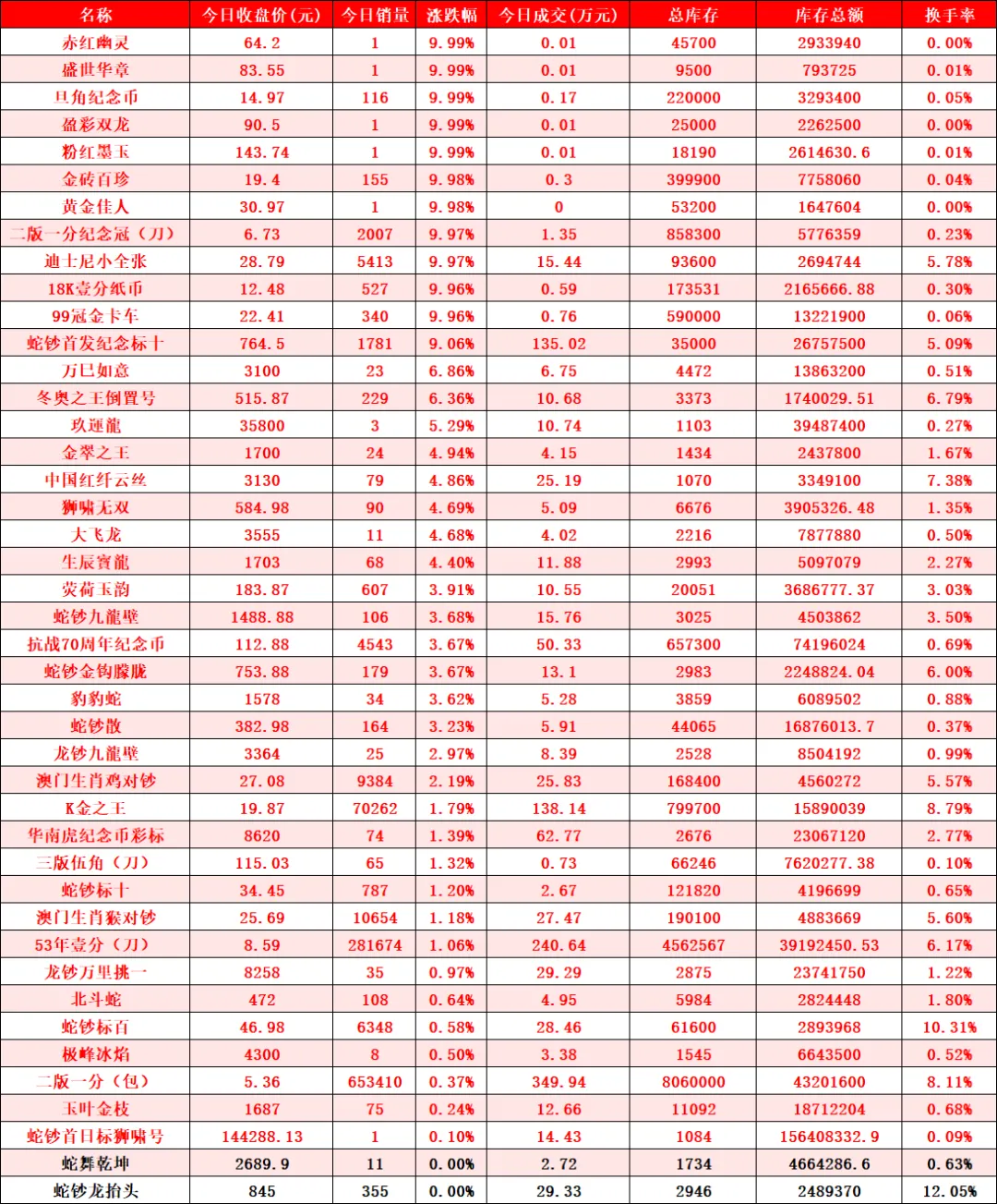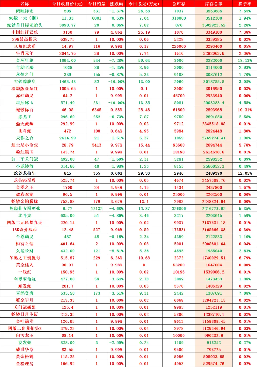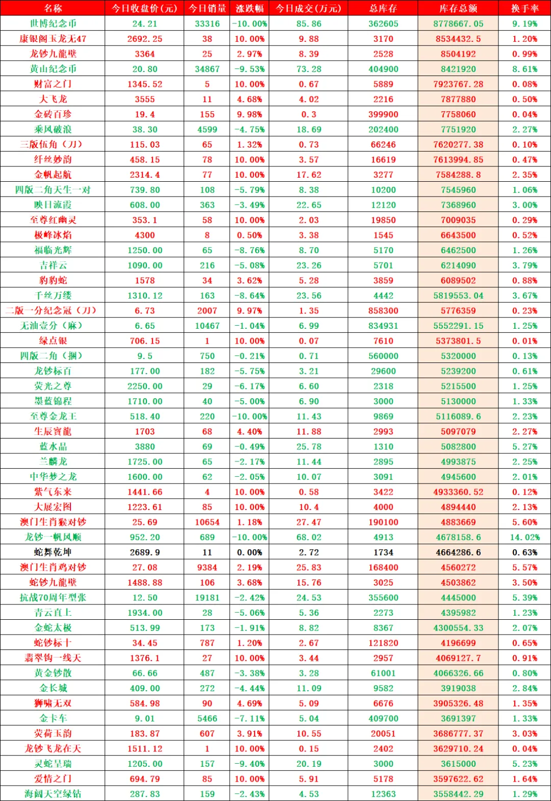 经过前两天的大幅上涨,今日迎来小幅调整,龙头品种表现依然亮眼,行情仍在。截止收盘,甄选155家品种,上涨83家(其中涨停53家),平盘2家,下跌70家(其中跌停7家),市场规模小幅回撤至26.23亿元。