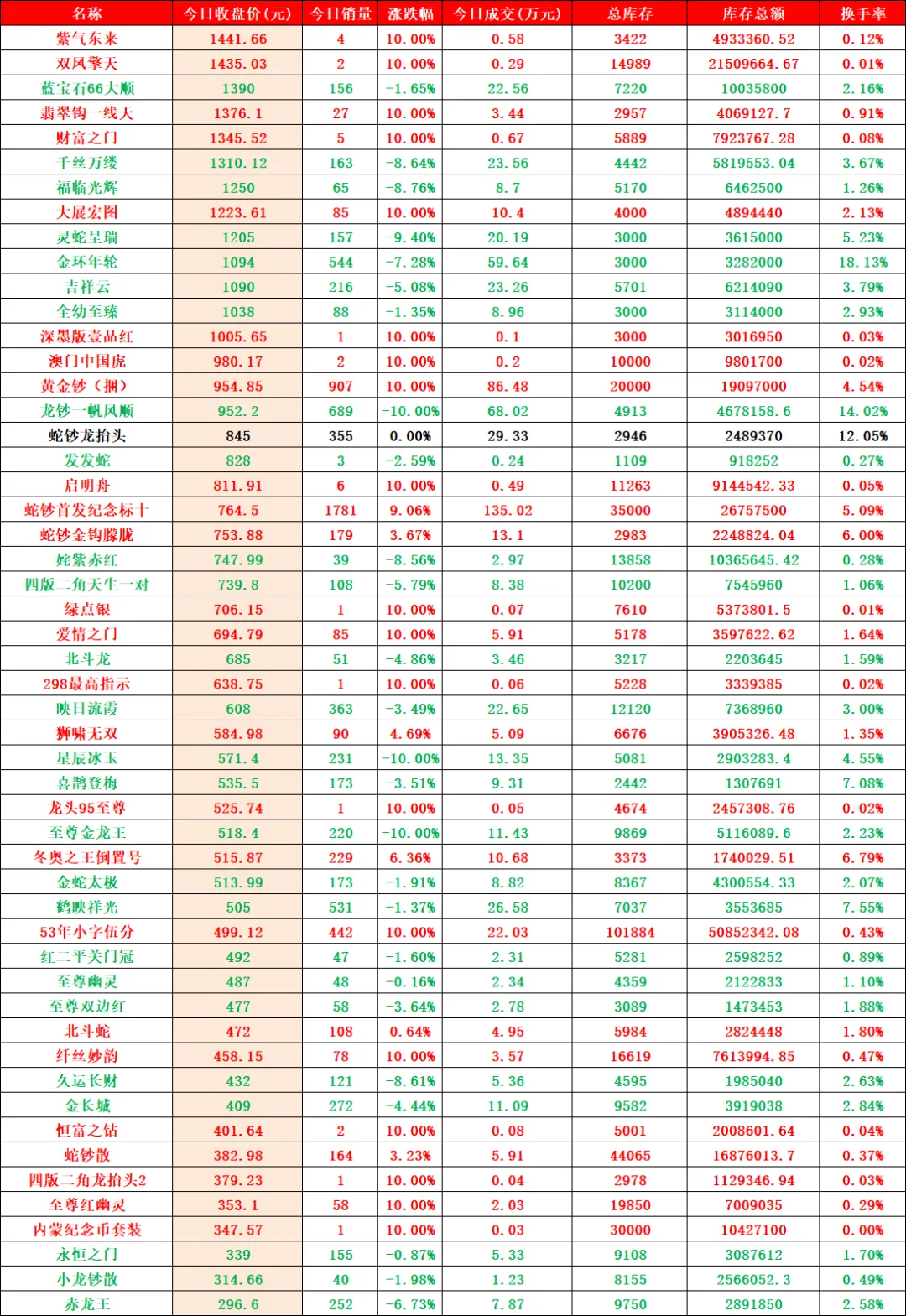 豹豹蛇,连涨2天,涨幅收窄,承接不太积极,抛盘较重,仍有调整需求,应避免追高。